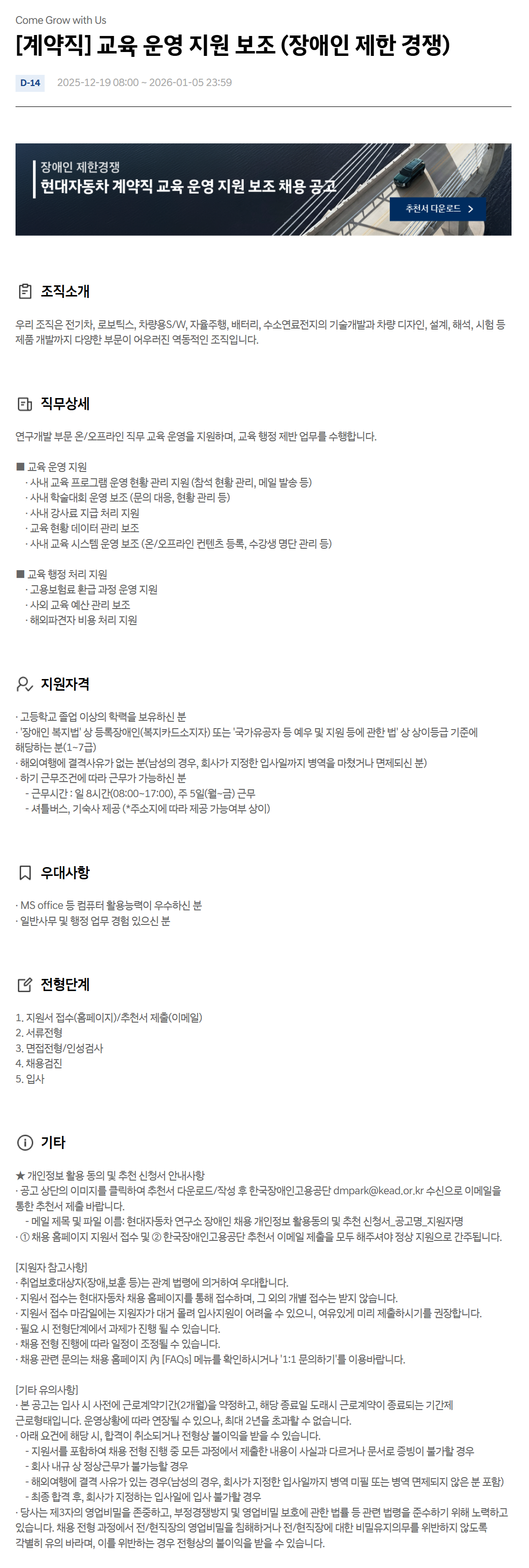 [현대자동차] [계약직] 교육 운영 지원 보조 (장애인 제한 경쟁) 채용