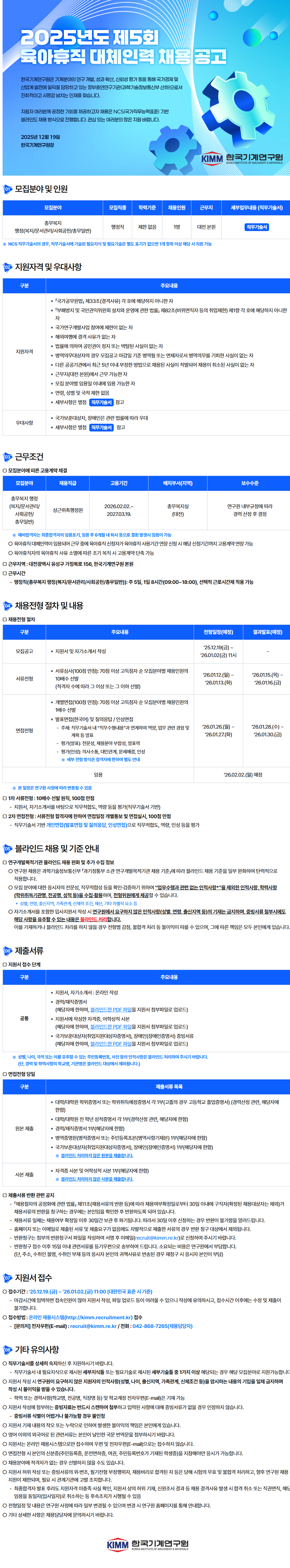 [한국기계연구원] 2025년 제5회 육아휴직 대체인력 채용 공고