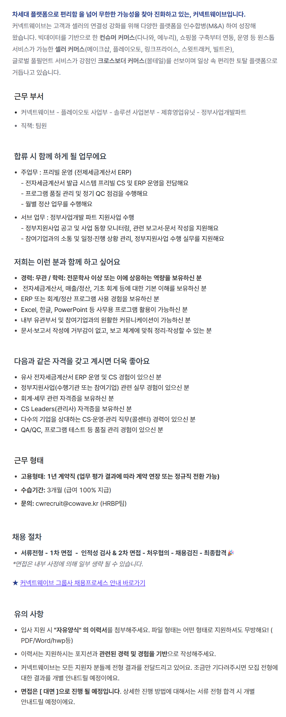 [커넥트웨이브] [플레이오토] 전자세금계산서(프리빌) 운영·정산·CS 담당자