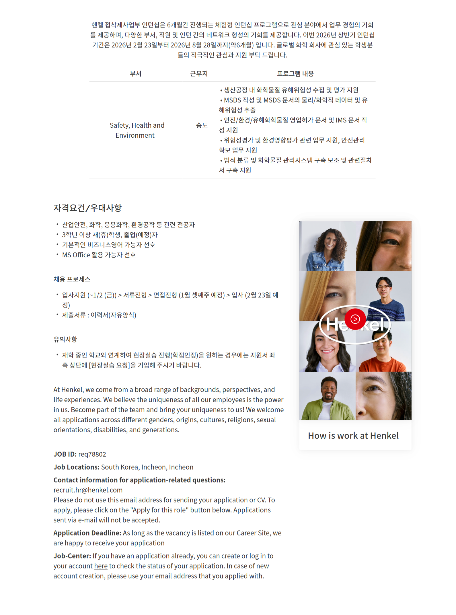 - 근무지역: 인천 연수구 송도국제대로343번길 99 헨켈코리아