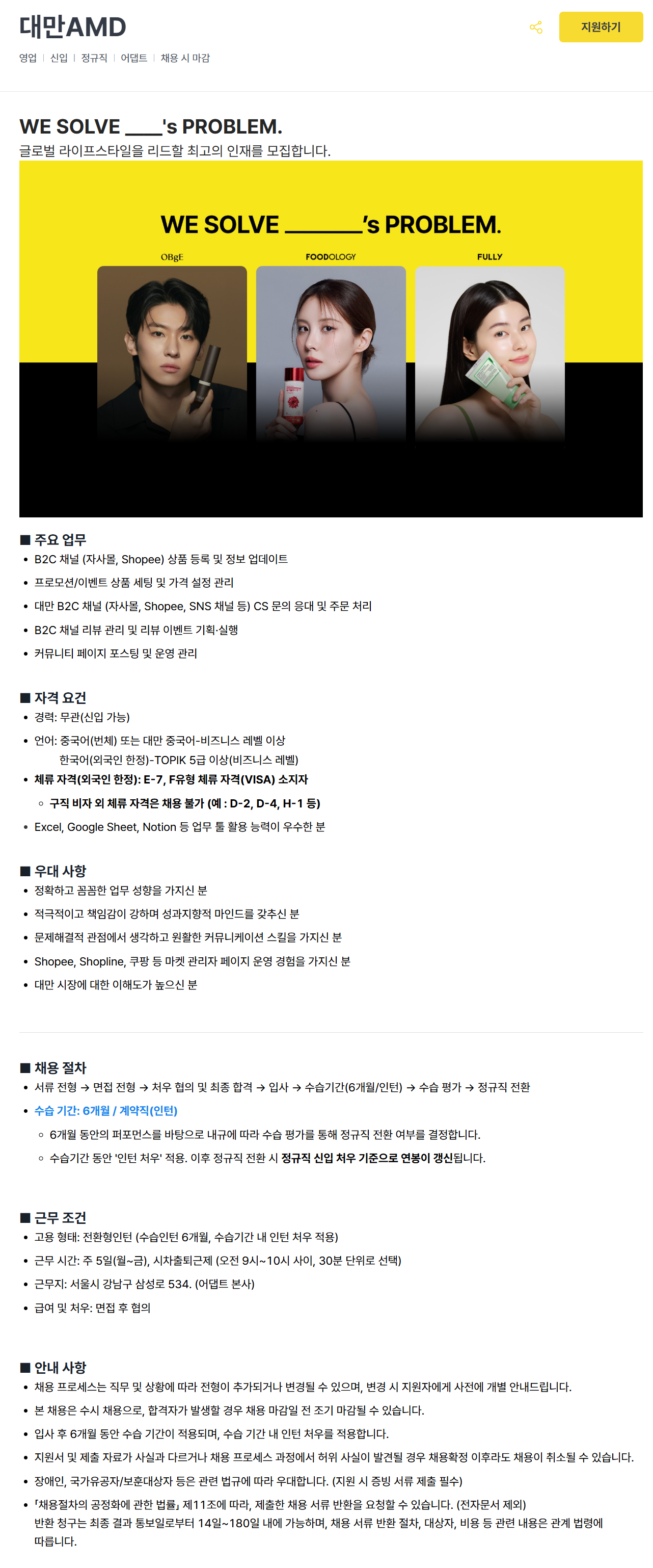- 대만 B2C 채널 (자사몰, Shopee, SNS 채널 등) CS 문의 응대 및 주문 처리
