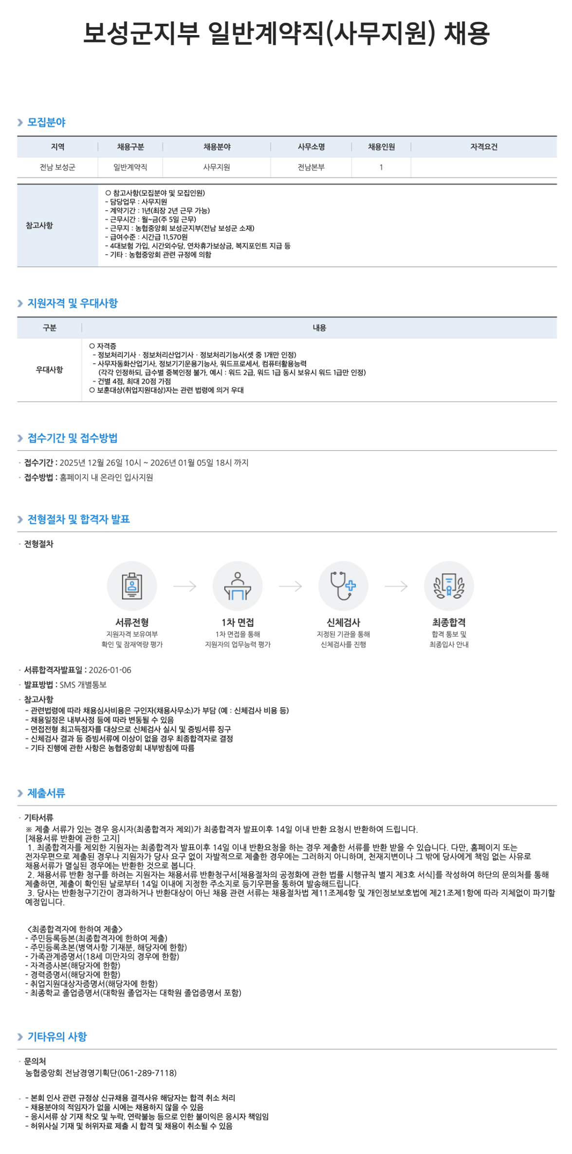 [농업협동조합중앙회] 보성군지부 일반계약직(사무지원) 채용