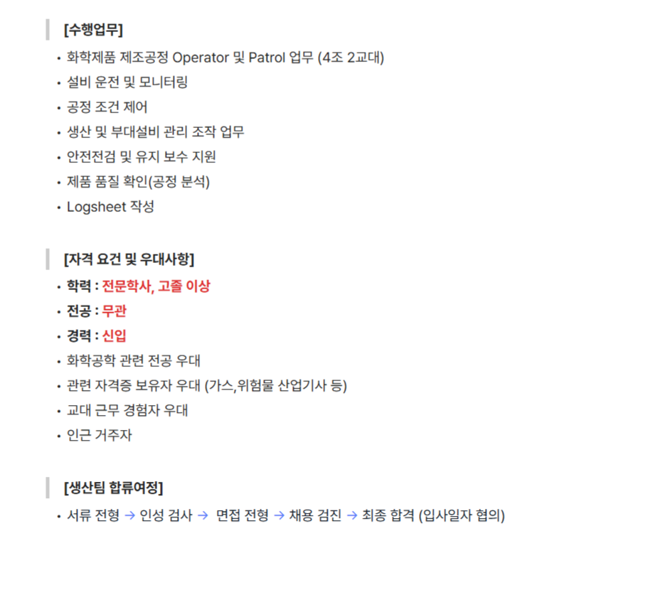 - 화학제품 제조공정 Operator 및 Patrol 업무 (4조 2교대)