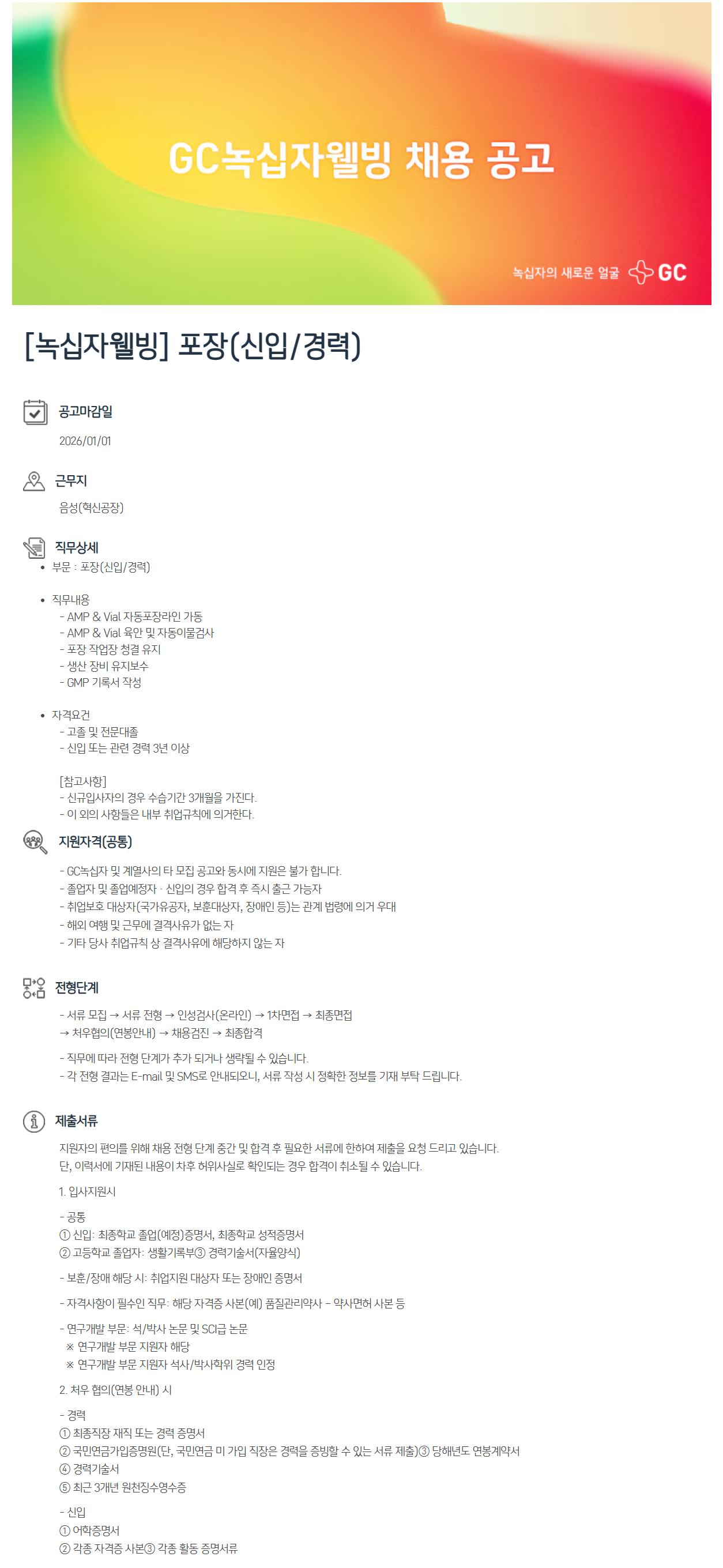 [GC녹십자웰빙] 포장(신입/경력)