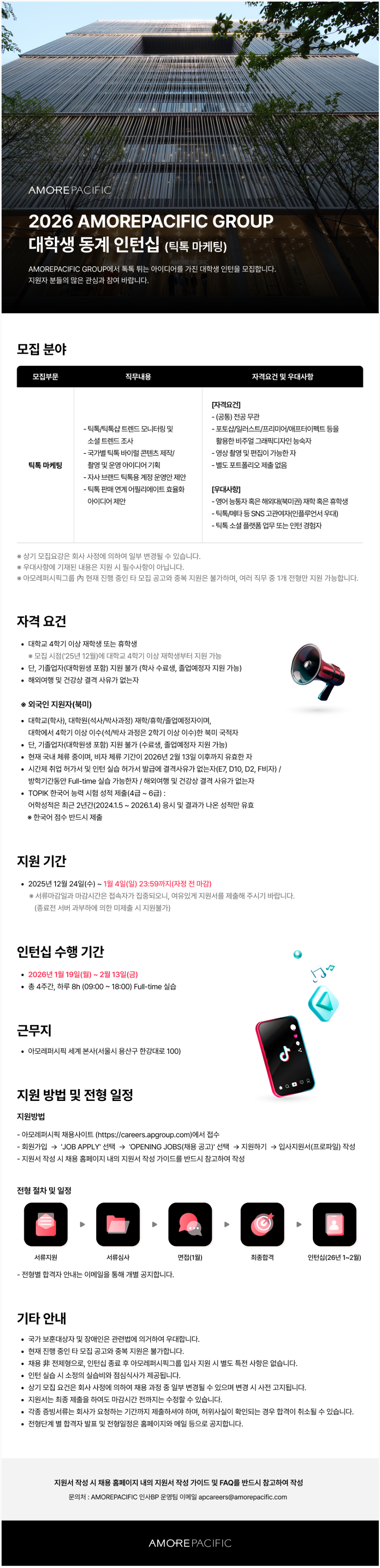 [아모레퍼시픽] [인턴] 26년 대학생 동계 인턴십 (틱톡 마케팅)