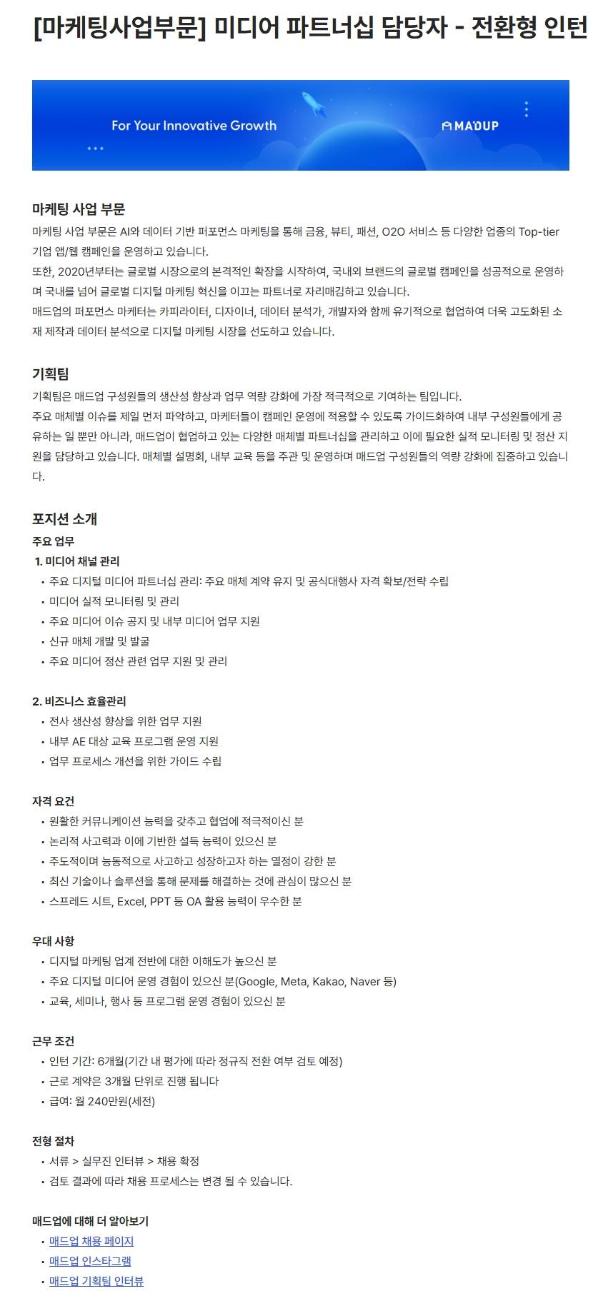 [매드업] [마케팅사업부문] 미디어 파트너십 담당자 - 전환형 인턴