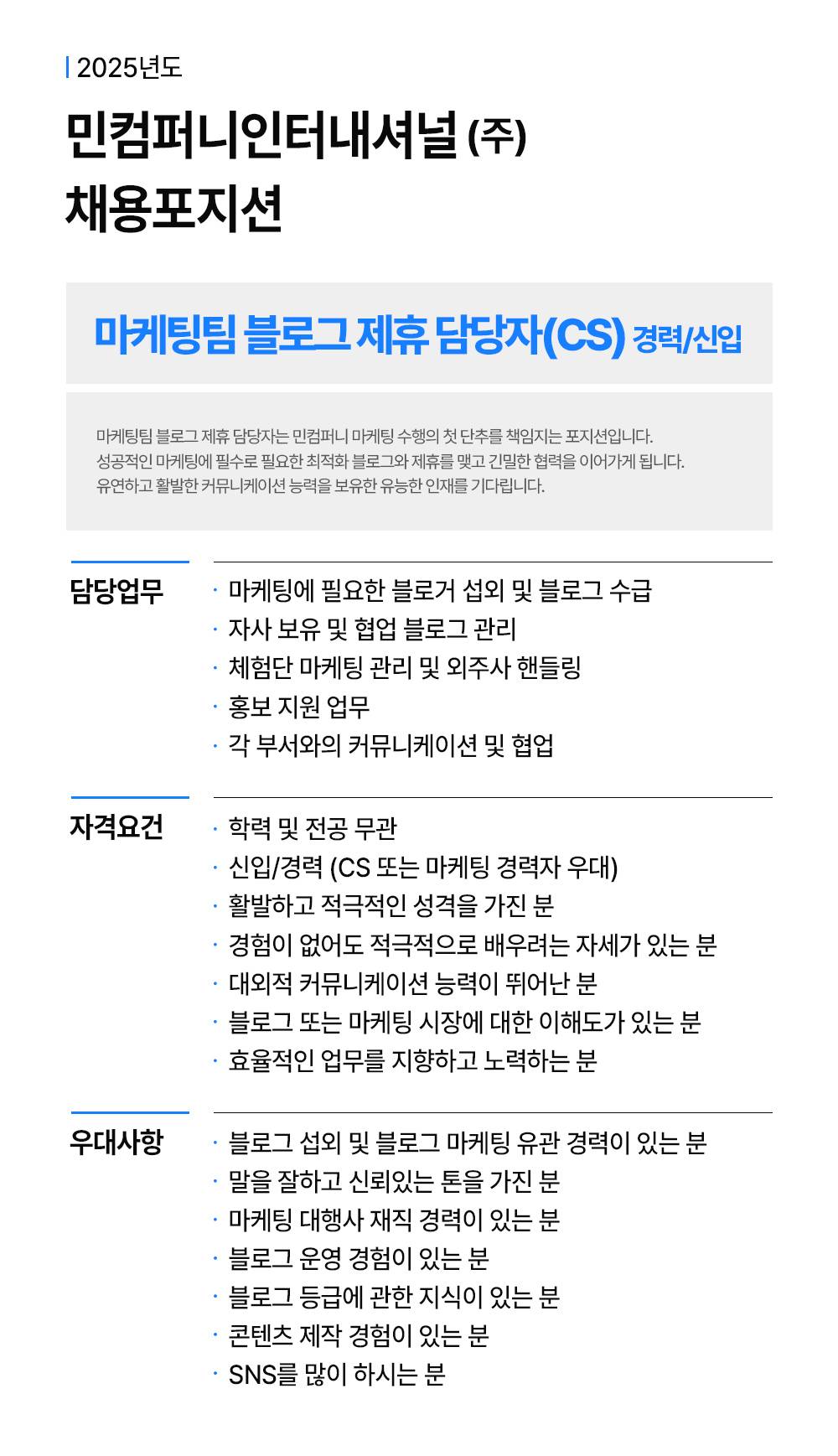 [강소기업] 마케팅팀 블로그 제휴 담당자 (CS)