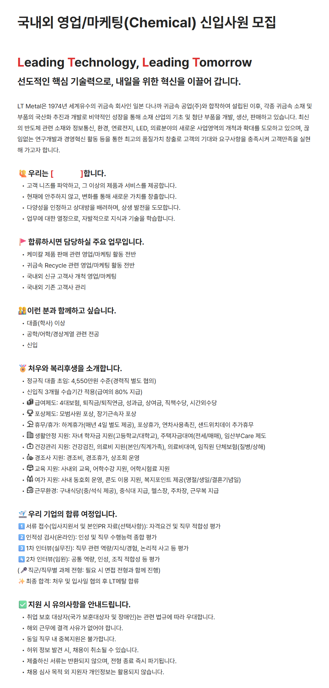 [LT메탈] 국내외 영업/마케팅(Chemical) 신입사원 모집