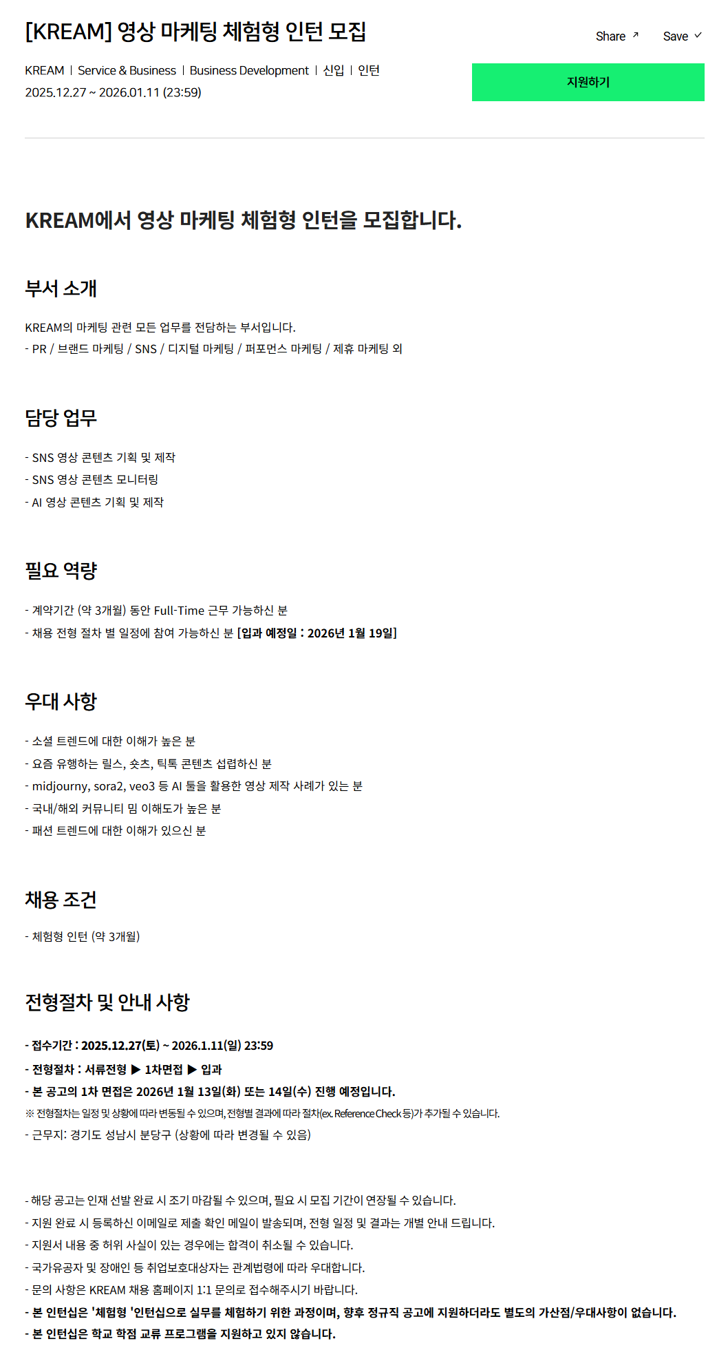 [크림(KREAM)] 영상 마케팅 체험형 인턴 모집