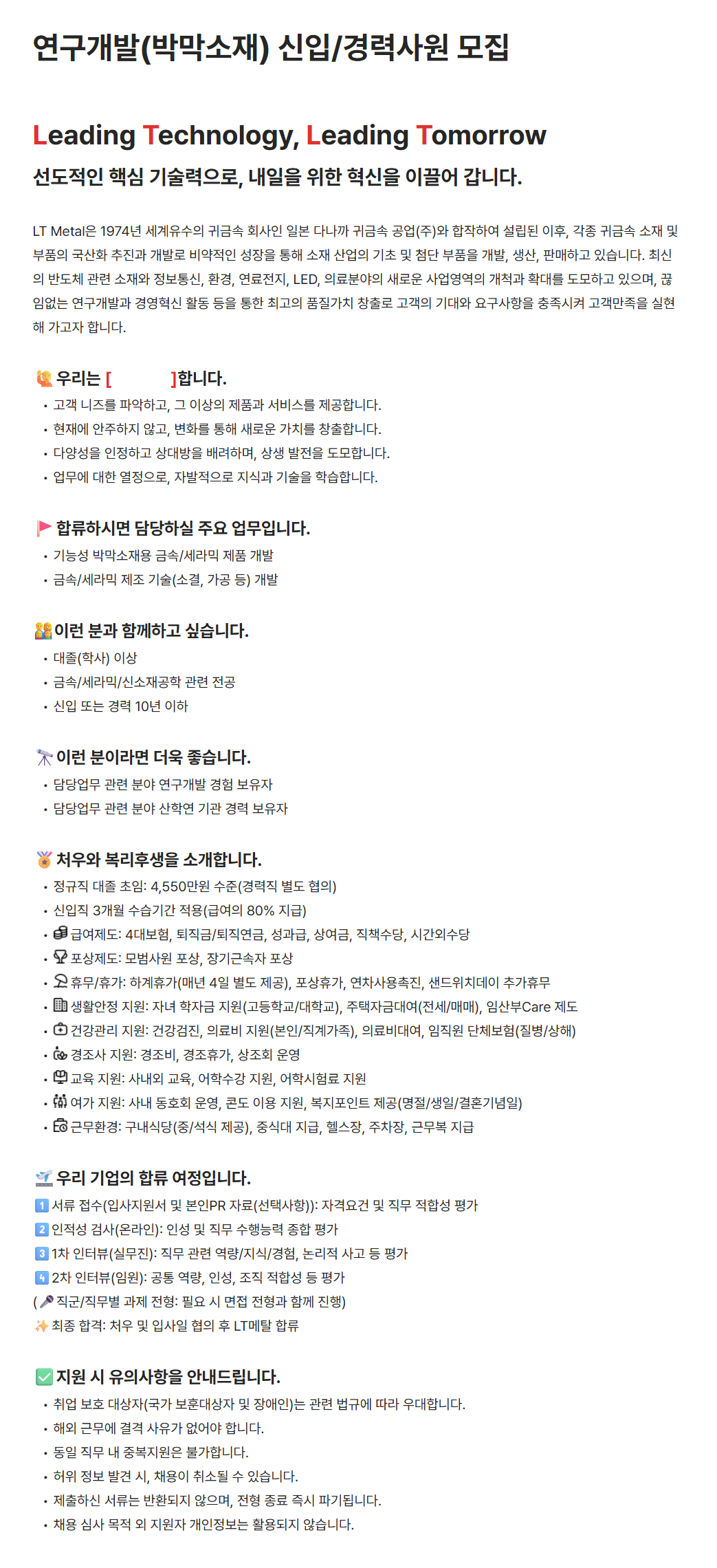 [LT메탈] 연구개발(박막소재) 신입/경력사원 모집