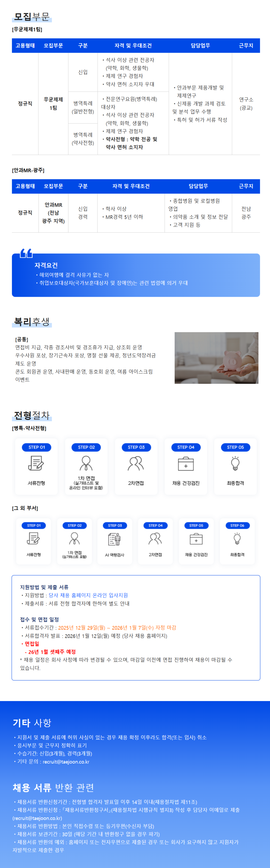 [태준제약] 26.01 연구소 제제팀 전문연구요원 채용(병역특례-약사)
