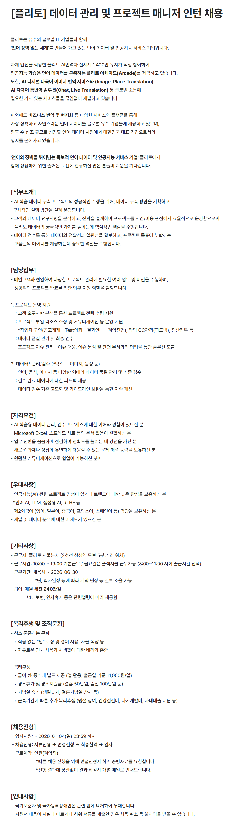 [플리토] 데이터 관리 및 프로젝트 매니저 인턴 채용