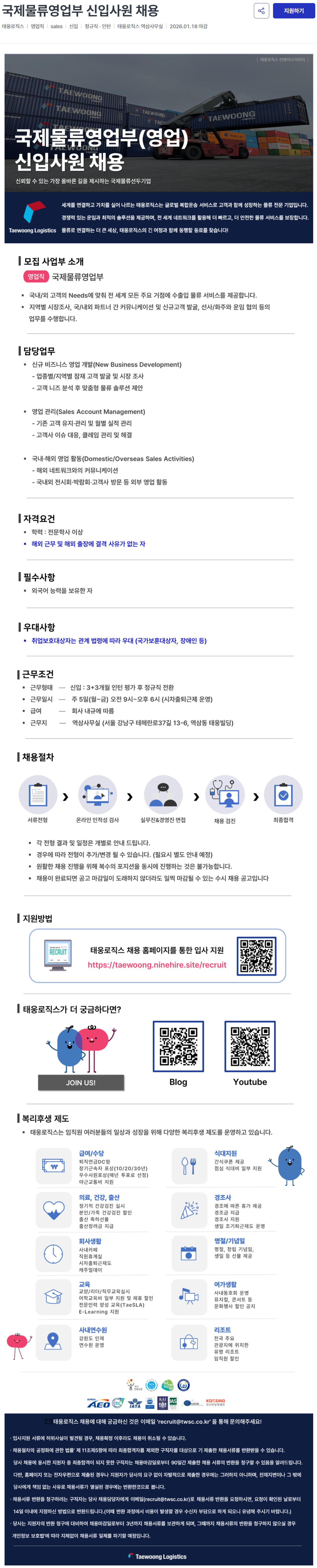 [태웅로직스] 국제물류영업부 신입사원 채용