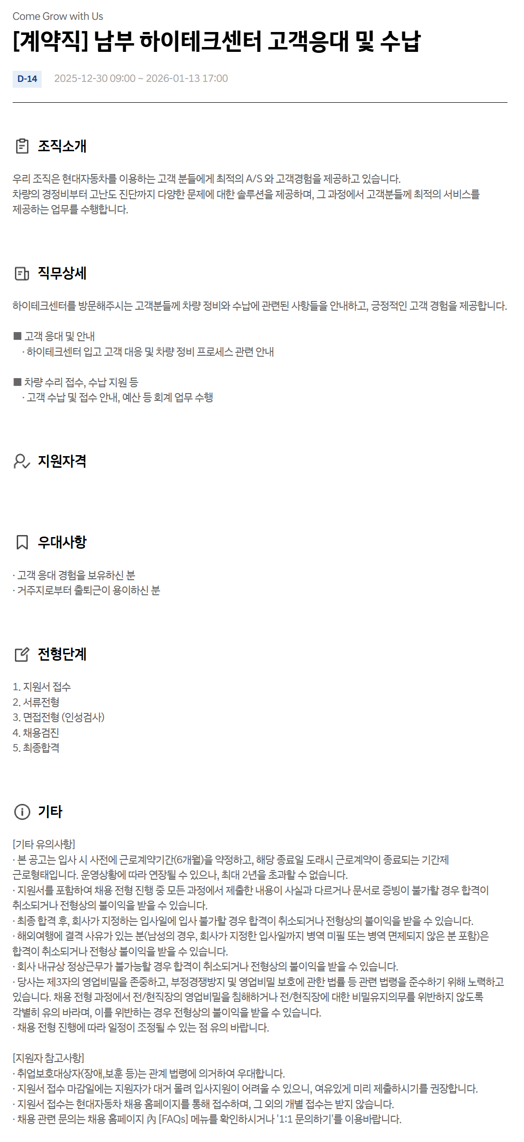 [현대자동차] [계약직] 남부 하이테크센터 고객응대 및 수납