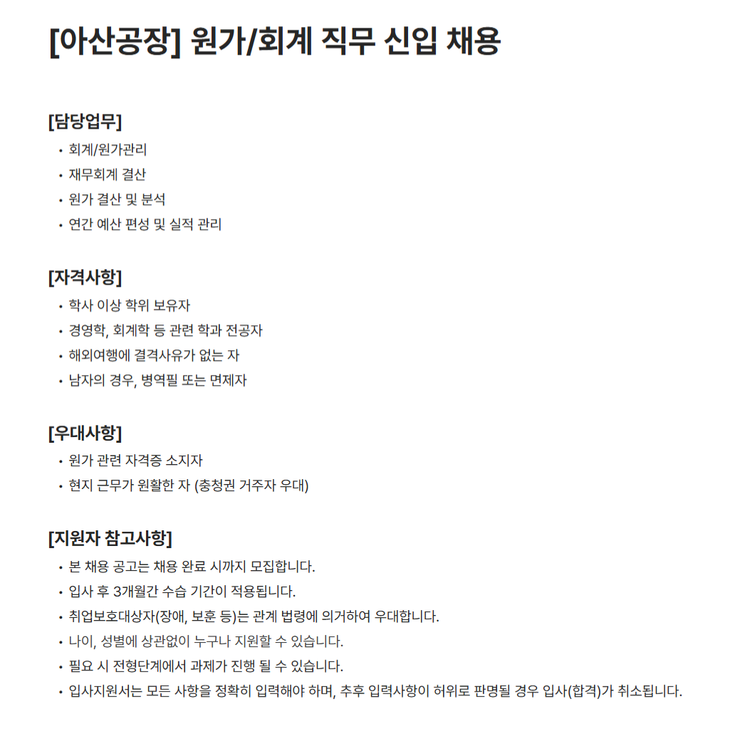 원가/회계 직무 채용(신입-아산공장)