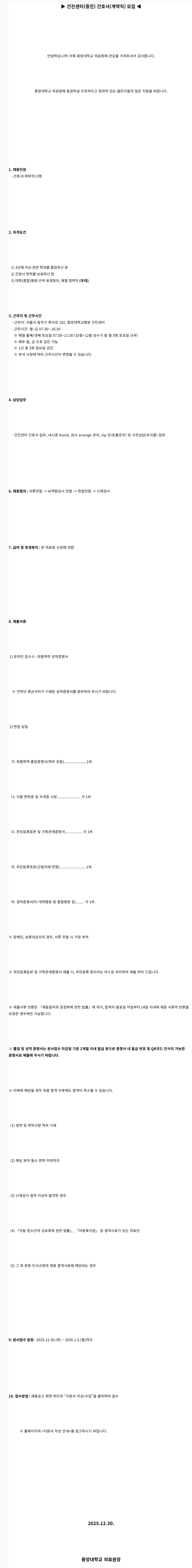 [중앙대학교병원] (서울병원) 건진센터(증진) 간호사(계약직) 모집 (2025.12)