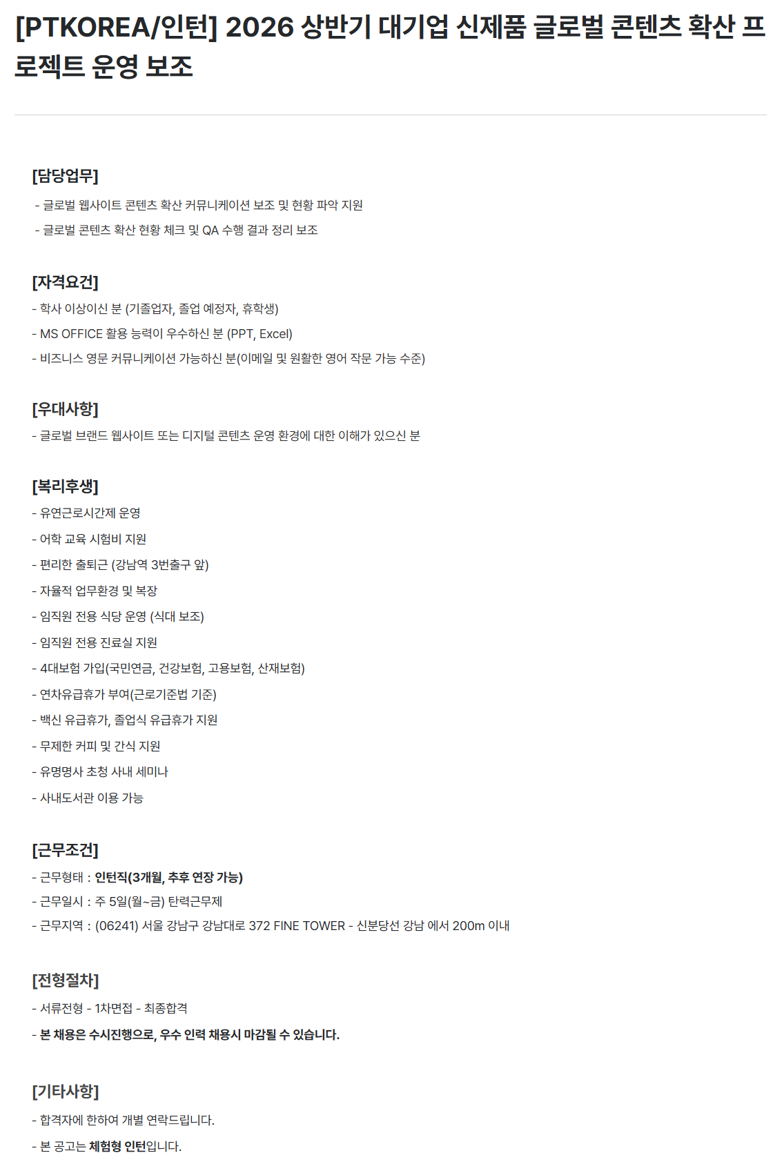 [PTKOREA] 2026년 상반기 대기업 신제품 글로벌 콘텐츠 확산 프로젝트 운영 보조