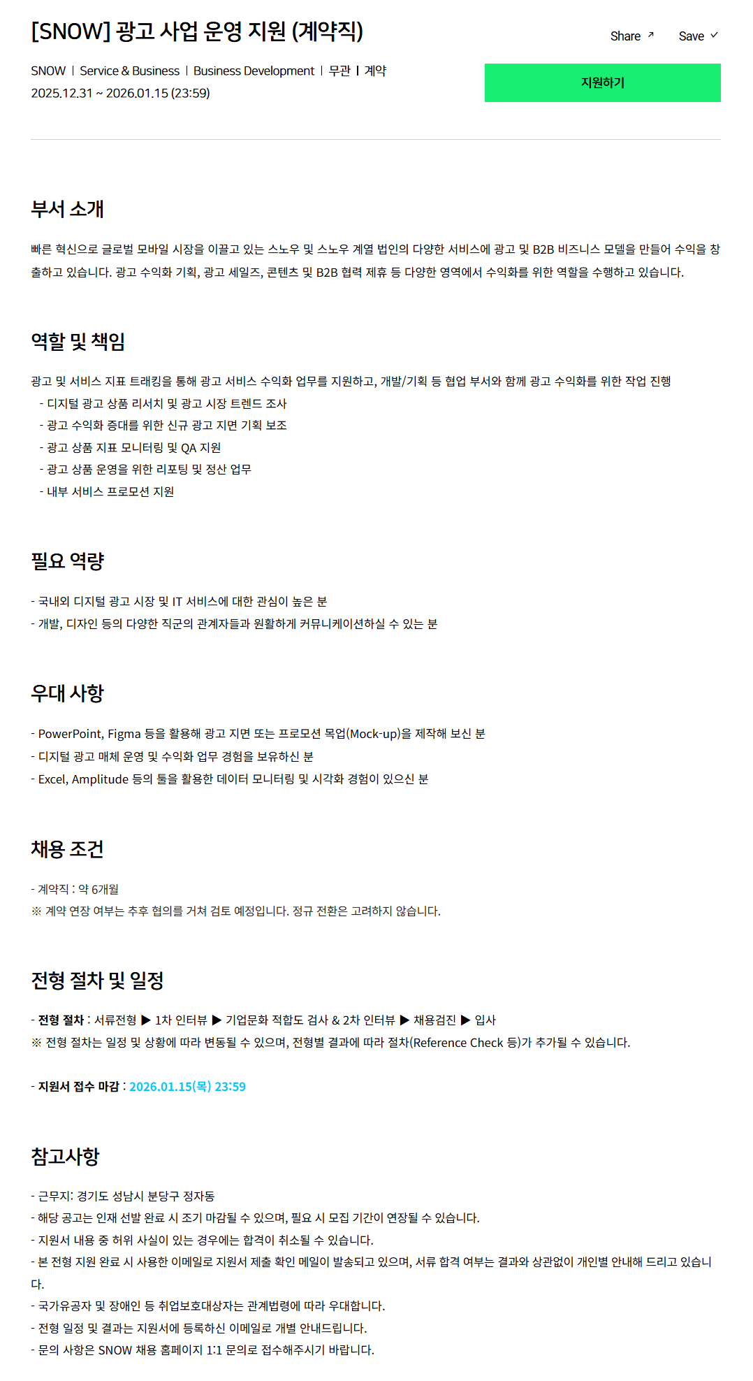 [SNOW] 광고 사업 운영 지원 (계약직)