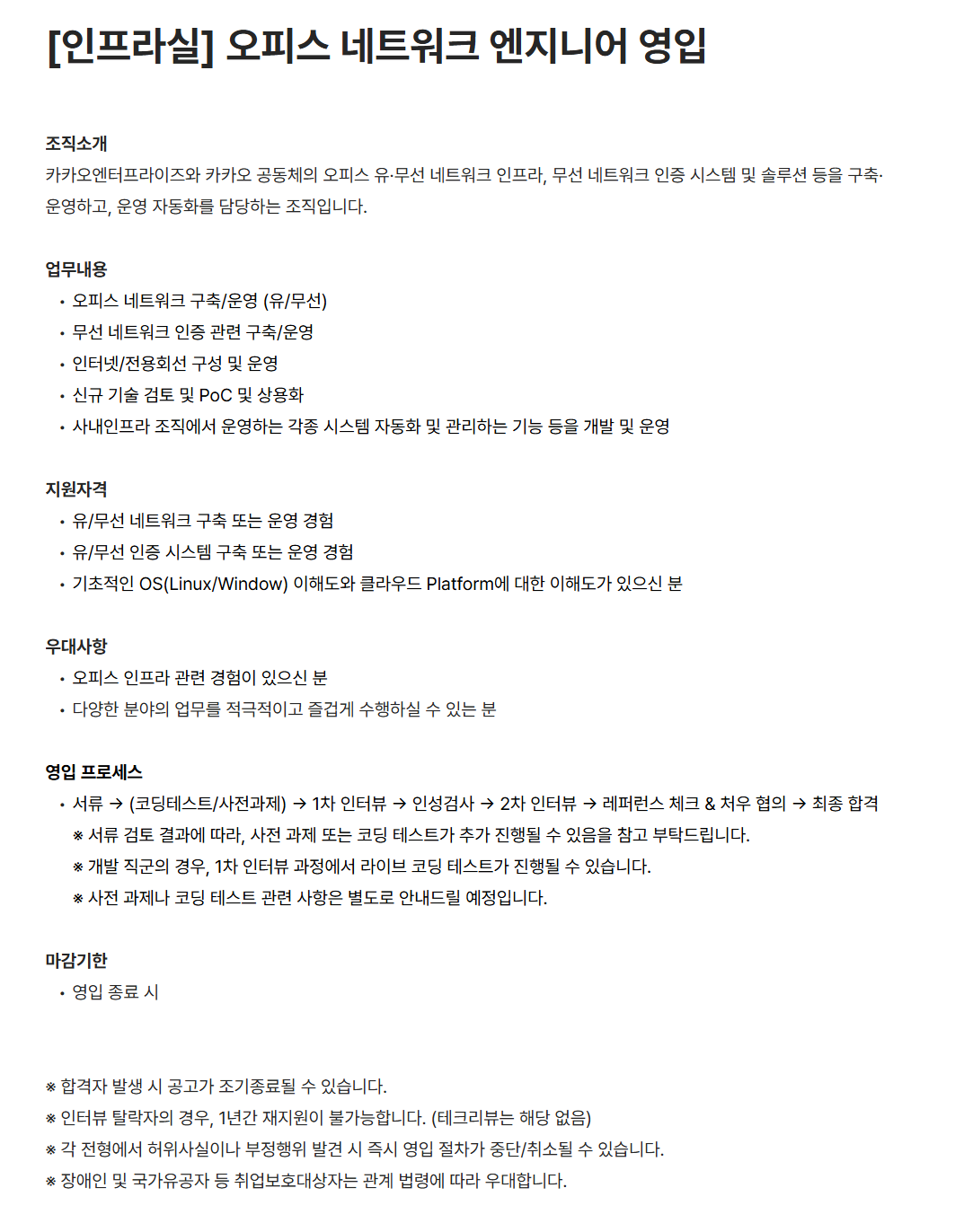 [카카오엔터프라이즈] [인프라실] 오피스 네트워크 엔지니어 영입