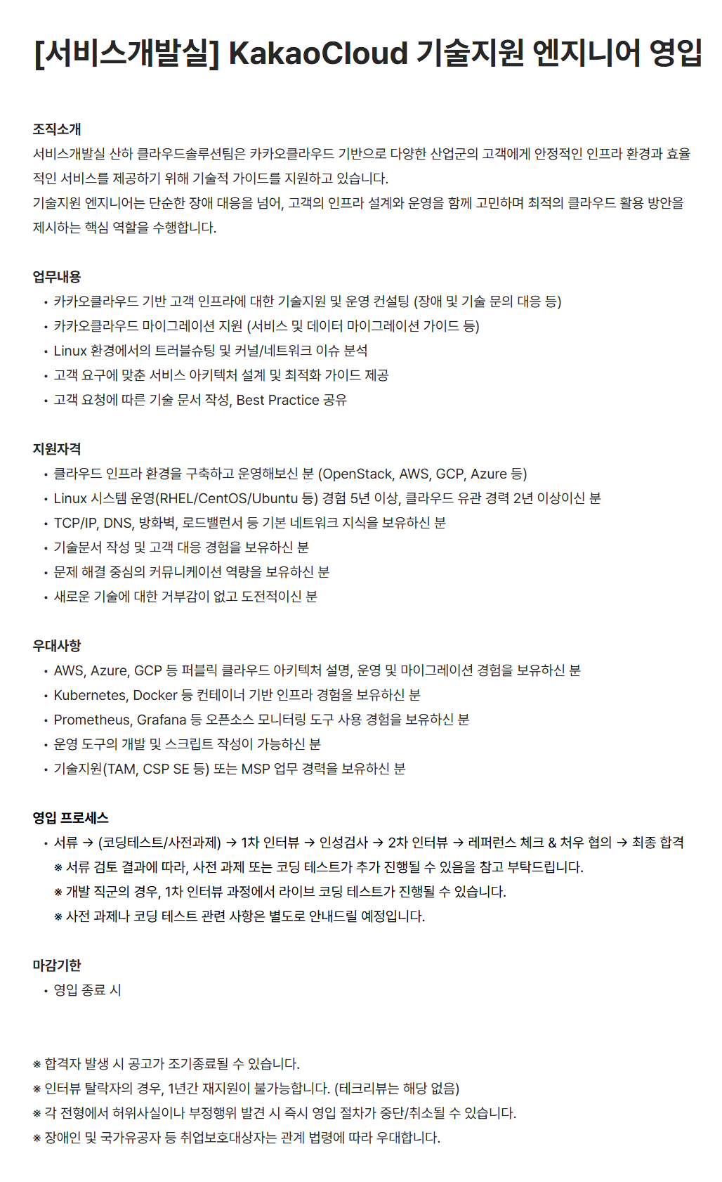 [카카오엔터프라이즈] [서비스개발실] KakaoCloud 기술지원 엔지니어 영입