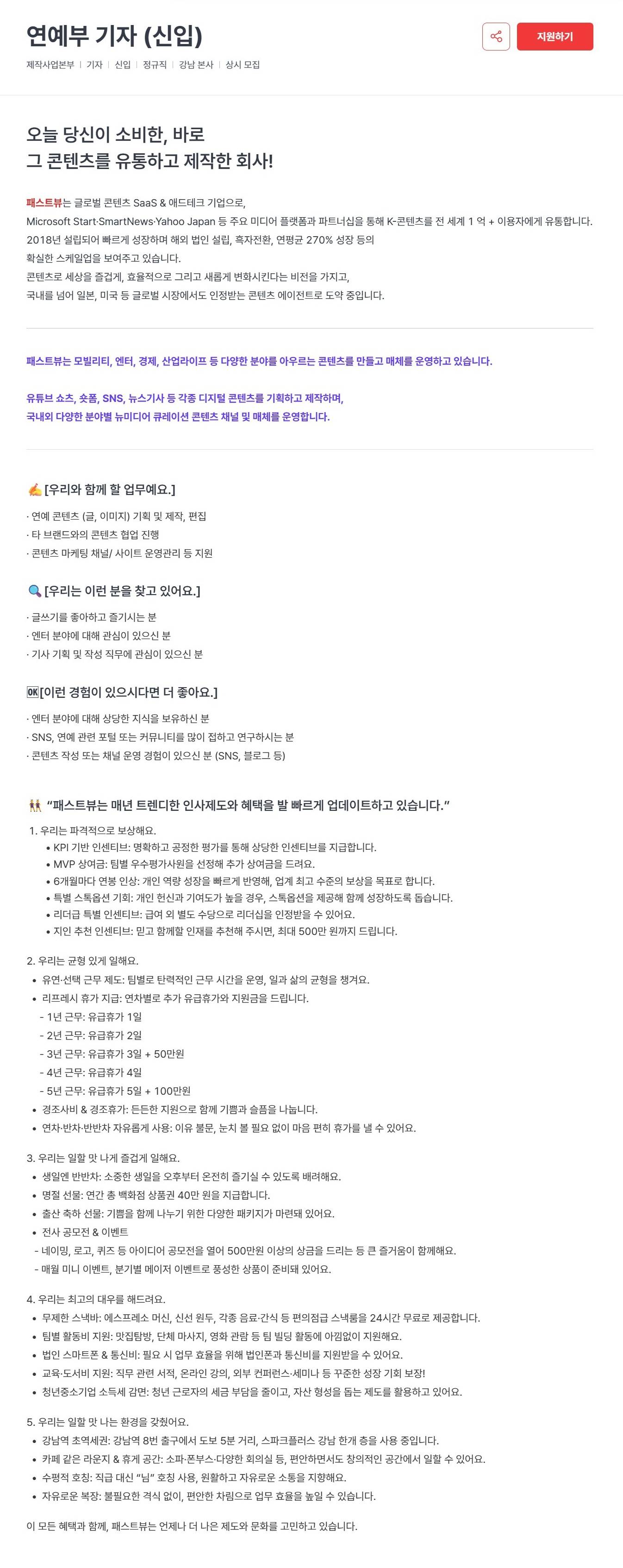 [주식회사 패스트뷰] 연예부 기자 (신입)