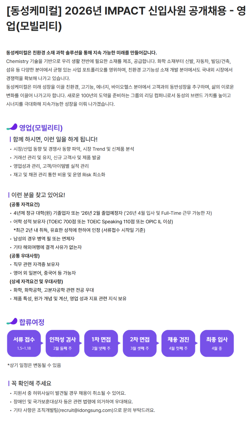 ㅇ 화학, 화학공학, 고분자공학 관련 전공 우대