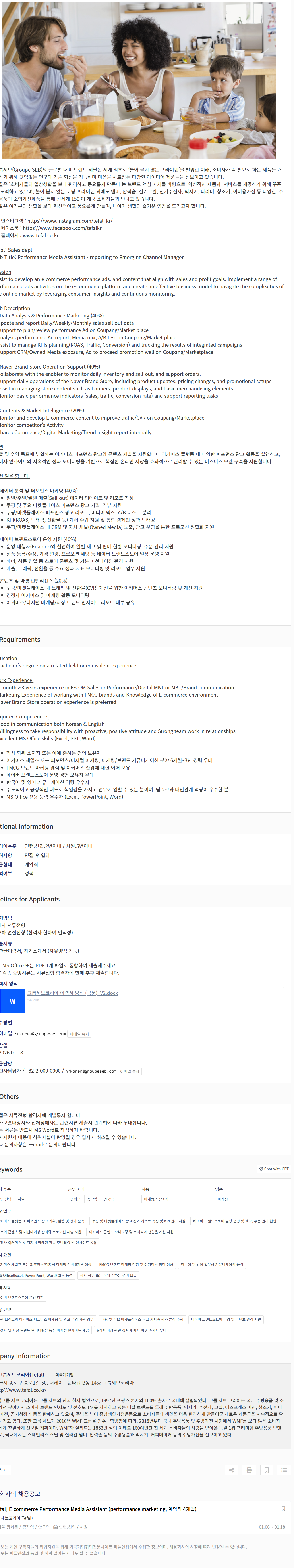 [그룹세브코리아] [테팔] 이커머스 영업 > 퍼포먼스 마케팅 계약직 채용(4개월)