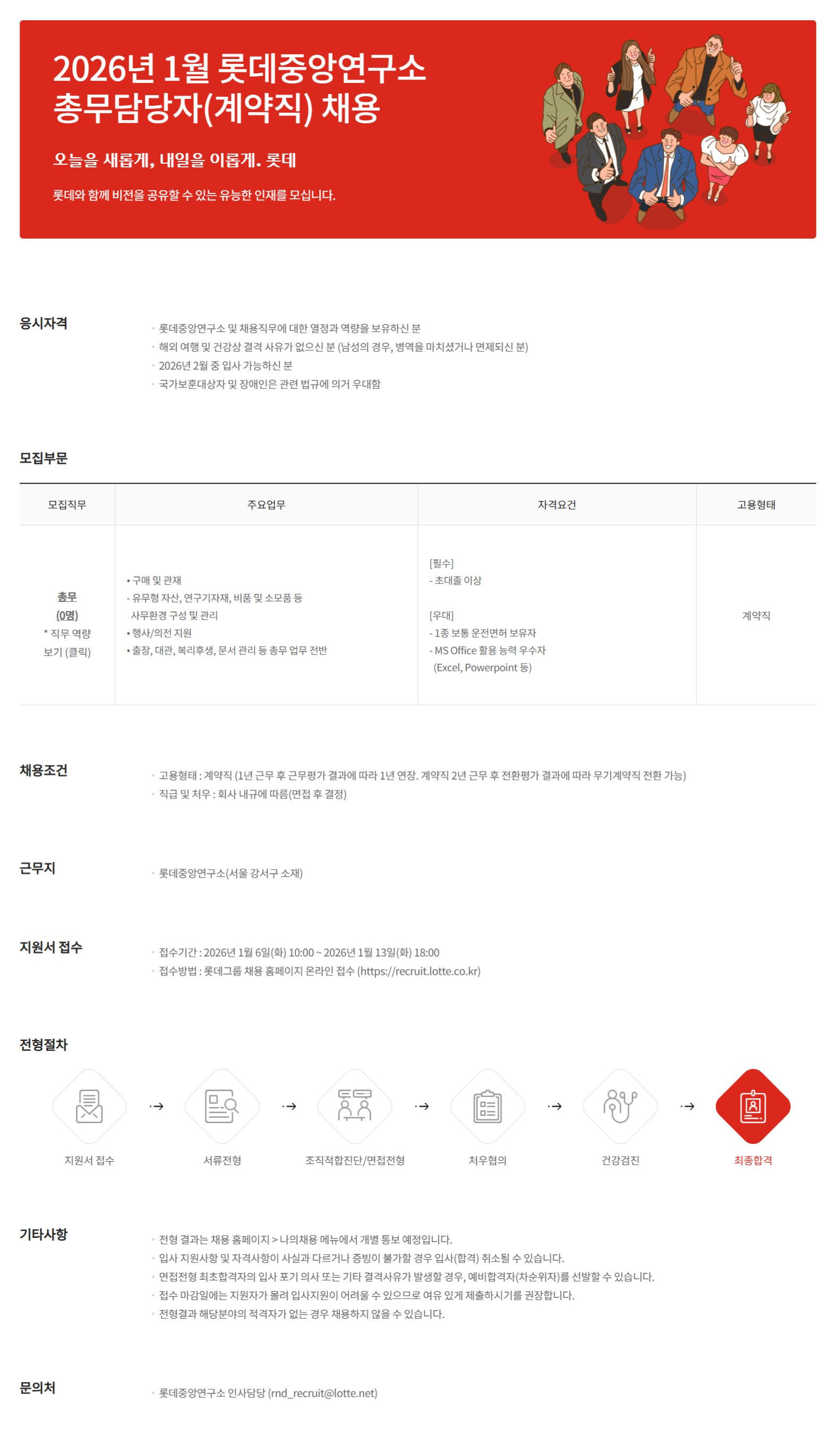 [롯데중앙연구소] 2026년 1월 총무담당자 채용(계약직)