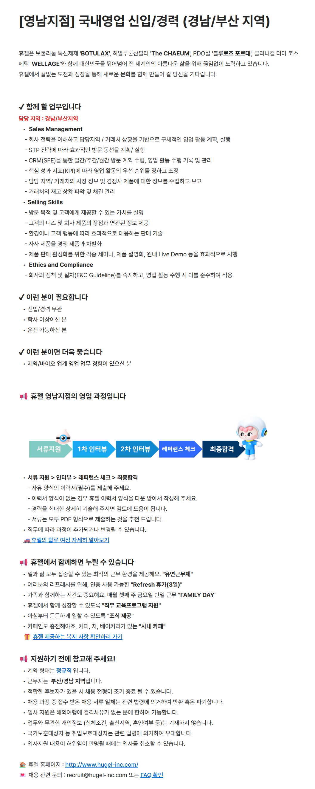 [휴젤] [영남지점] 국내영업 신입/경력 (경남/부산 지역)