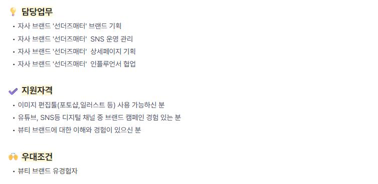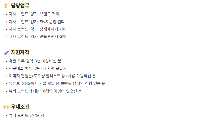 키워드 : 브랜드/브랜드마케터/ 마케팅 / 마케터 / 브랜드기획 / SNS / SNS 운영 / 상세페이지 / 상세페이지 기획 / 인플루언서 / 포토샵 / 일러스트 / 마케팅 전략 / 캠페인 운영 / 화장품 / 뷰티 / 스킨케어 / 색조 / 코스메틱