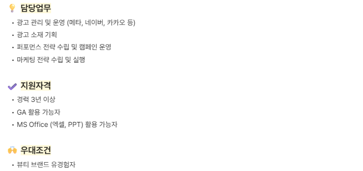 키워드 : 퍼포먼스/ 퍼포먼스마케터/ 마케팅 / 마케터 / 광고 / 운영 / 광고운영 / 메타 / 카카오 / 네이버 / 기획 / 캠페인 / 전략수립 / 마케팅 전략 / 캠페인 운영 / 화장품 / 뷰티 / 스킨케어 / 색조 / 코스메틱
