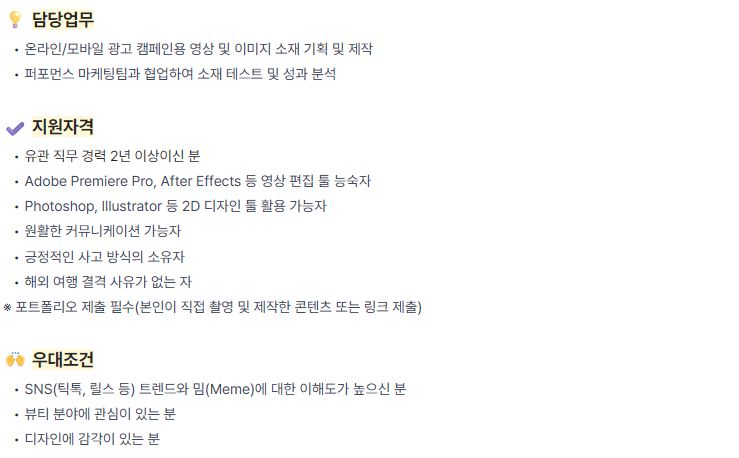 키워드 : AD / 광고 / 캠페인 / 온라인 / 소재테스트 / 성과분석 / 콘텐츠 / 콘텐츠기획 / 마케팅 / 마케터 / 바이럴 / 촬영 / 연출 / 편집 / 기획 / SNS / SNS콘텐츠 / 촬영편집 / 촬영기획 / 영상제작 / 화장품 / 뷰티 / 스킨케어 / 색조 / 코스메틱