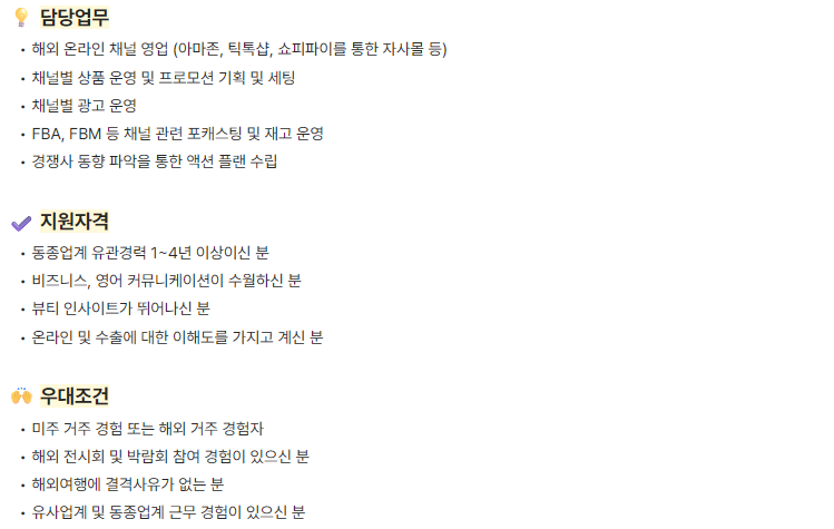 키워드 : 해외영업/ 온라인 / 채널영업 / 아마존 / amazon / 틱톡샵 / 쇼피파이 / 자사몰 / 상품운영 / 프로모션 기획 / 광고운영 / FBA / FBM / 포캐스팅 / 재고관리 / 재고운영 / 미주 / 미국 / 글로벌 / 세일즈 / 글로벌세일즈 / 온라인MD / 화장품 / 뷰티 / 스킨케어 / 색조 / 코스메틱