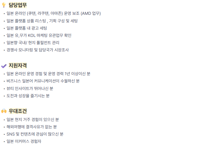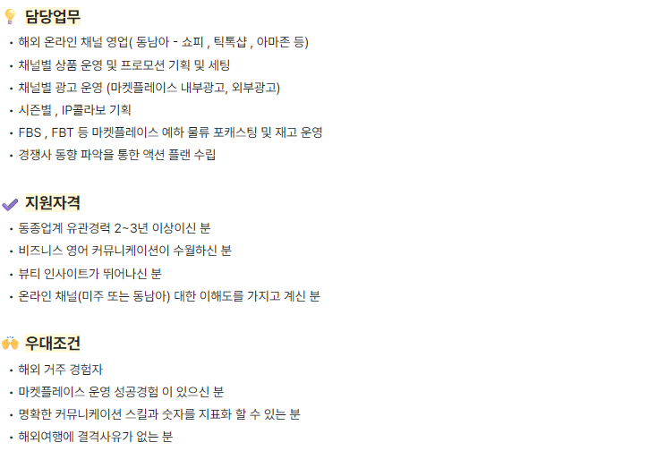 키워드 : 해외영업 / 온라인 / 채널영업 / 아마존 / amazon / 틱톡샵 / 쇼피 / shopee / 자사몰 / 상품운영 / 프로모션 기획 / 광고운영 / 마켓플레이스 / 내부광고 / 외부광고 / FBS / FBT / 포캐스팅 / 재고관리 / 재고운영 / 동남아 / 글로벌 / 세일즈 / 글로벌세일즈 / 온라인MD / 화장품 / 뷰티 / 스킨케어 / 색조 / 코스메틱