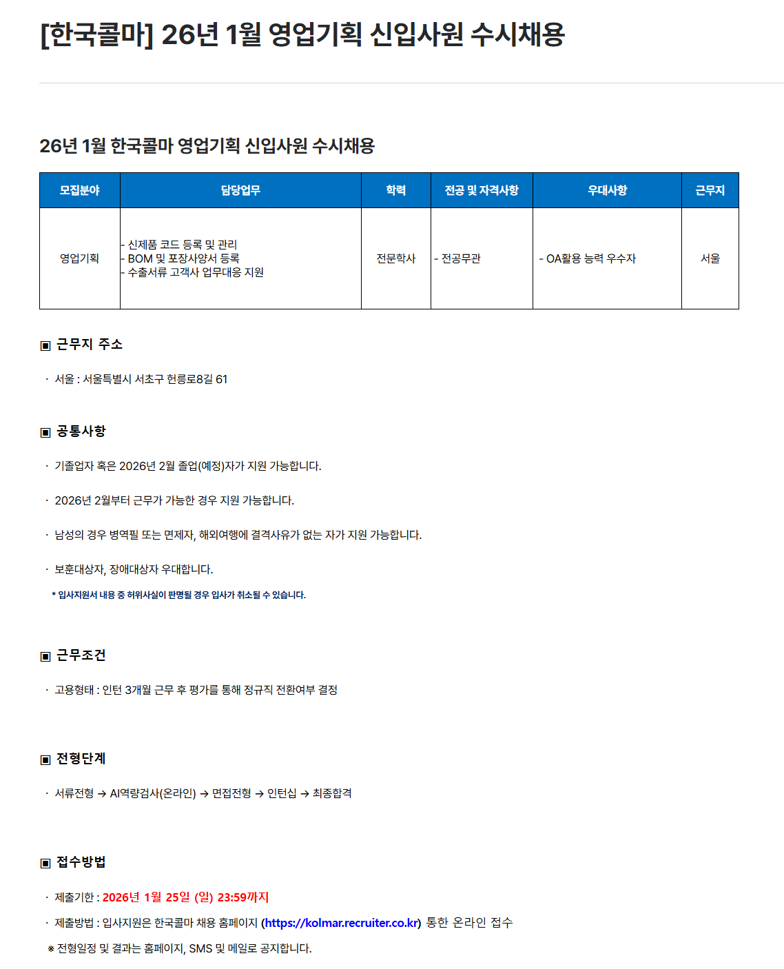 [한국콜마] 26년 1월 영업기획 신입사원 수시채용