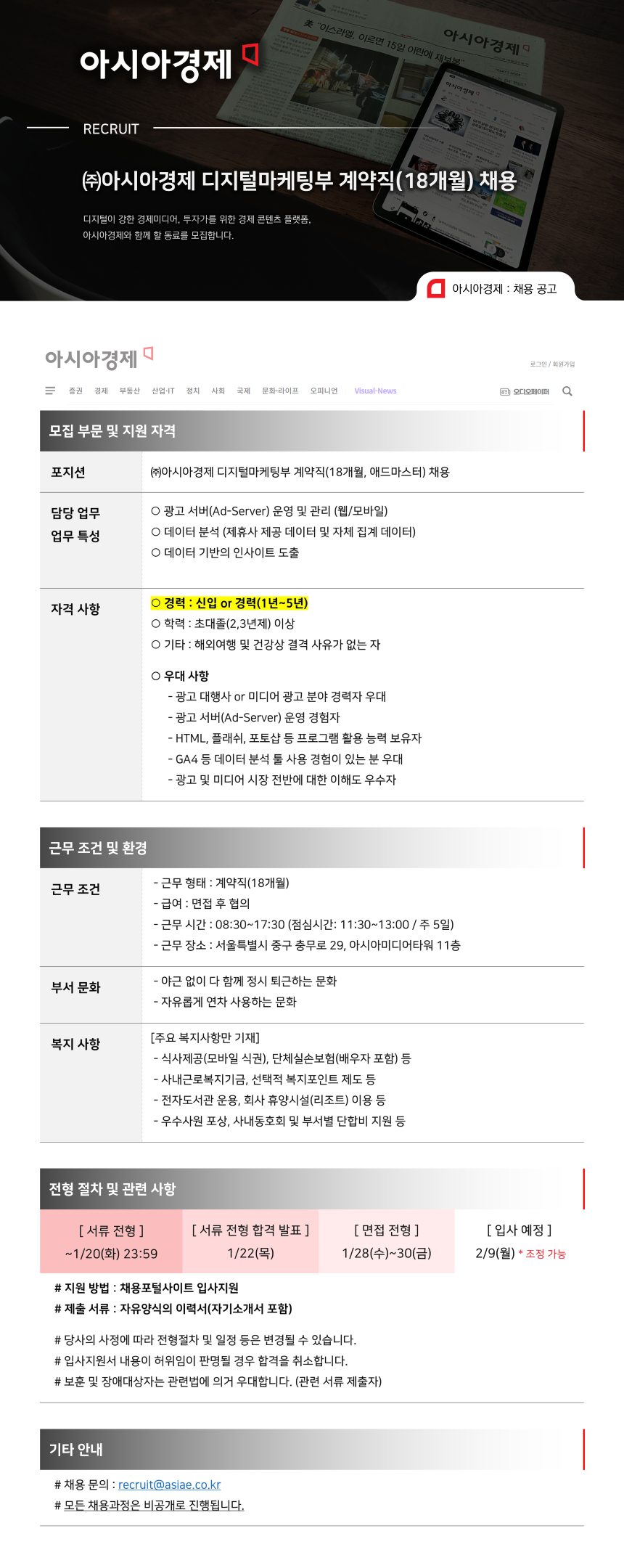 [아시아경제] 디지털마케팅부 계약직(18개월, 애드마스터) 채용