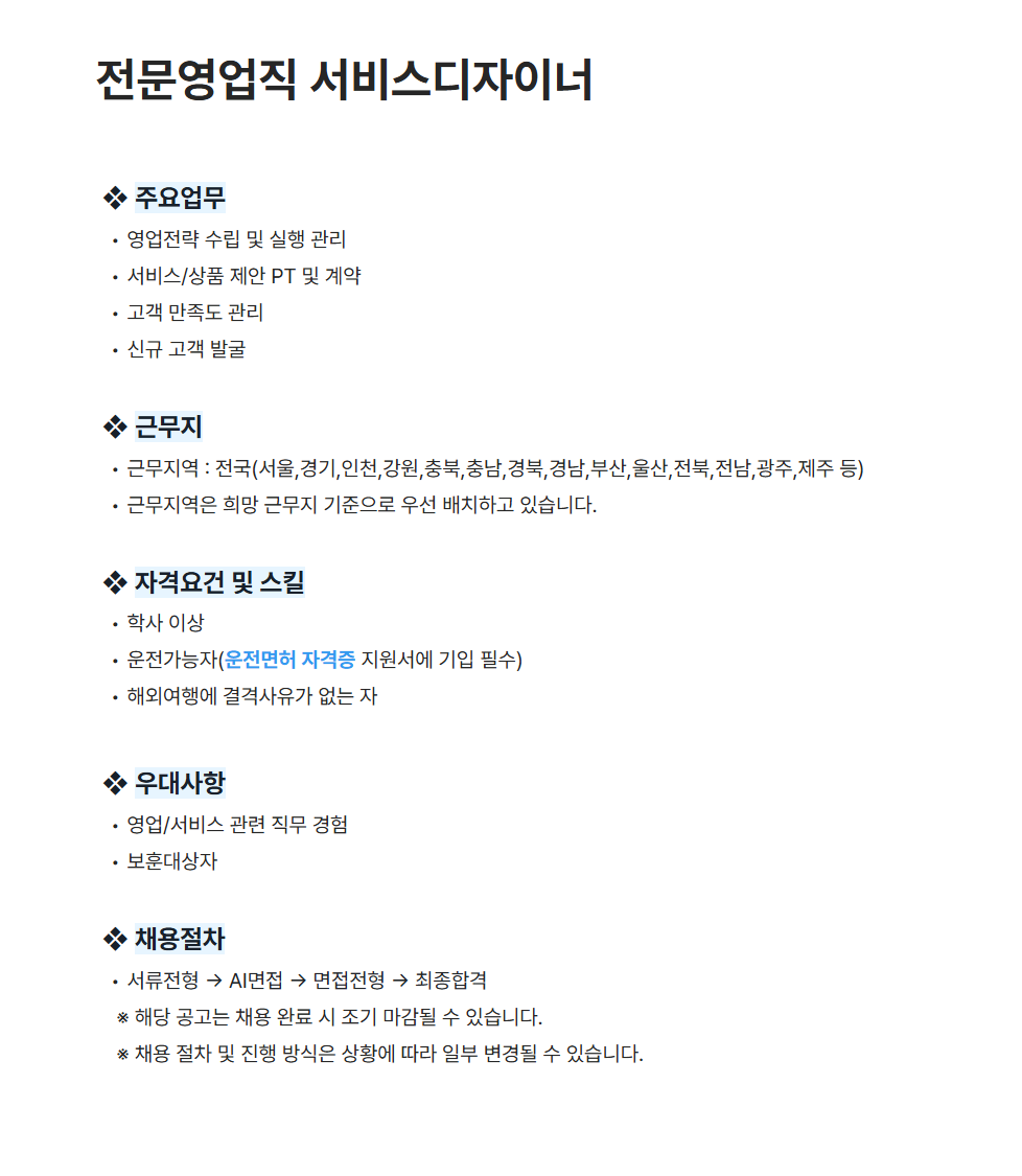 - 근무지역 : 전국(서울,경기,인천,강원,충북,충남,경북,경남,부산,울산,전북,전남,광주,제주 등)