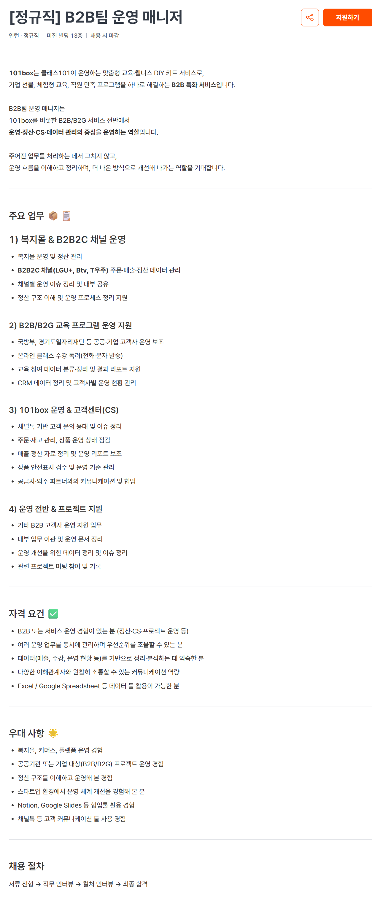 - B2B 또는 서비스 운영 경험이 있는 분 (정산·CS·프로젝트 운영 등)