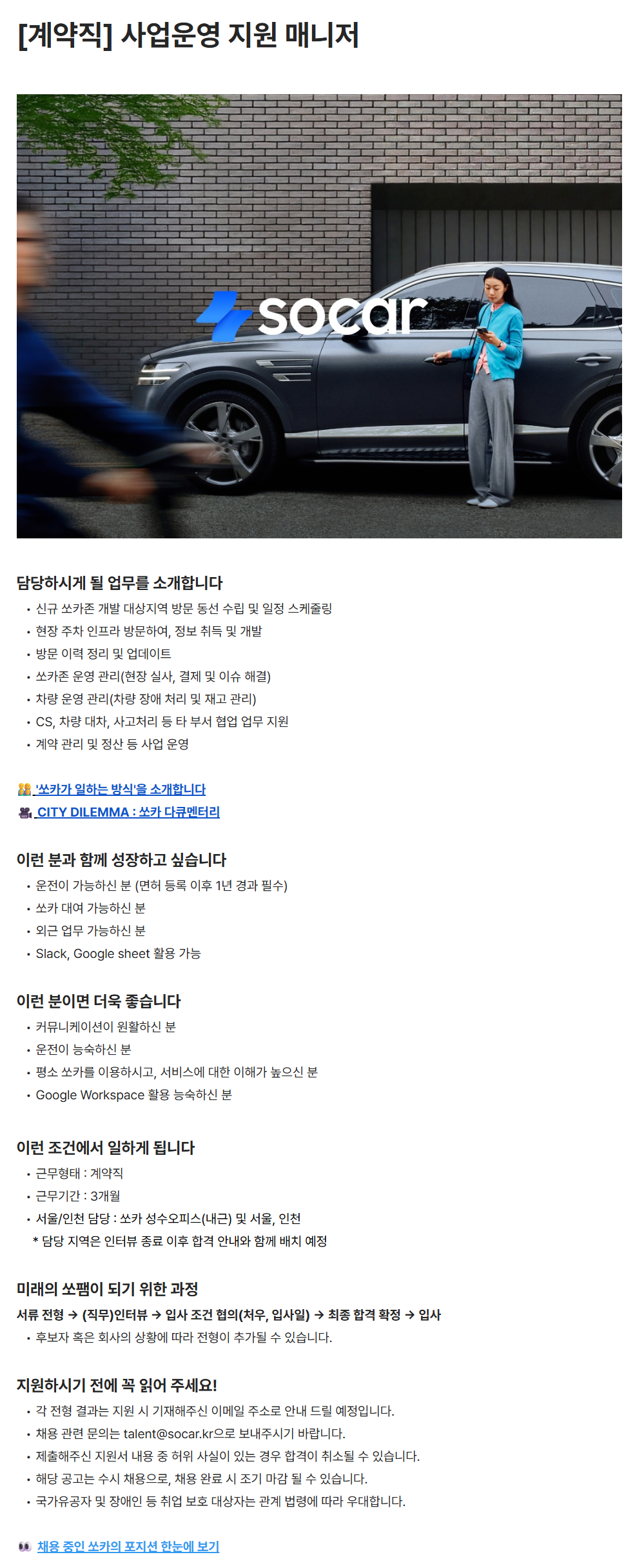 [쏘카] [계약직] 사업운영 지원 매니저