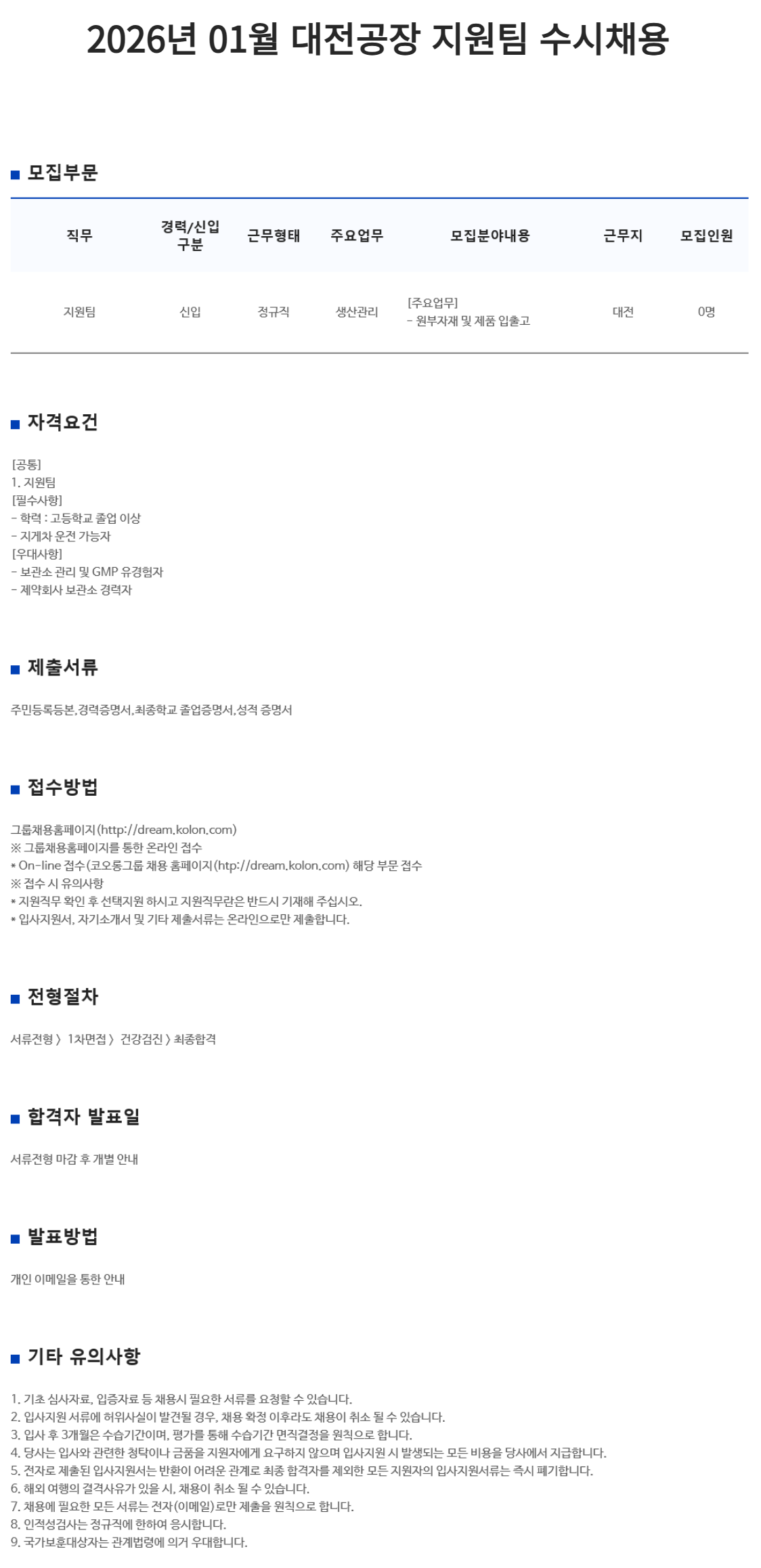 [코오롱제약] 2026년 01월 대전공장 지원팀 수시채용