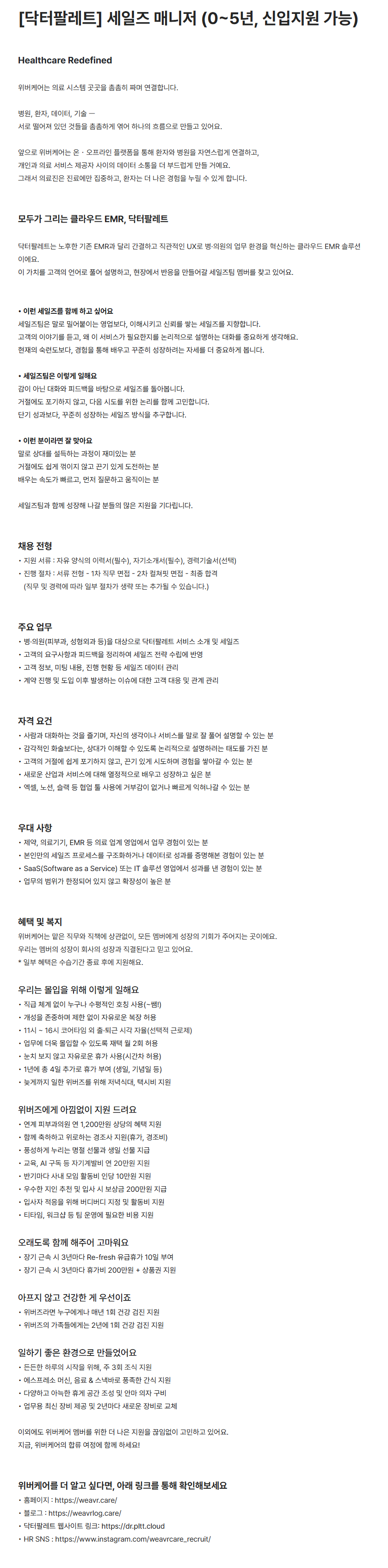 [위버케어] [닥터팔레트] 세일즈 매니저 (0~5년, 신입지원 가능)