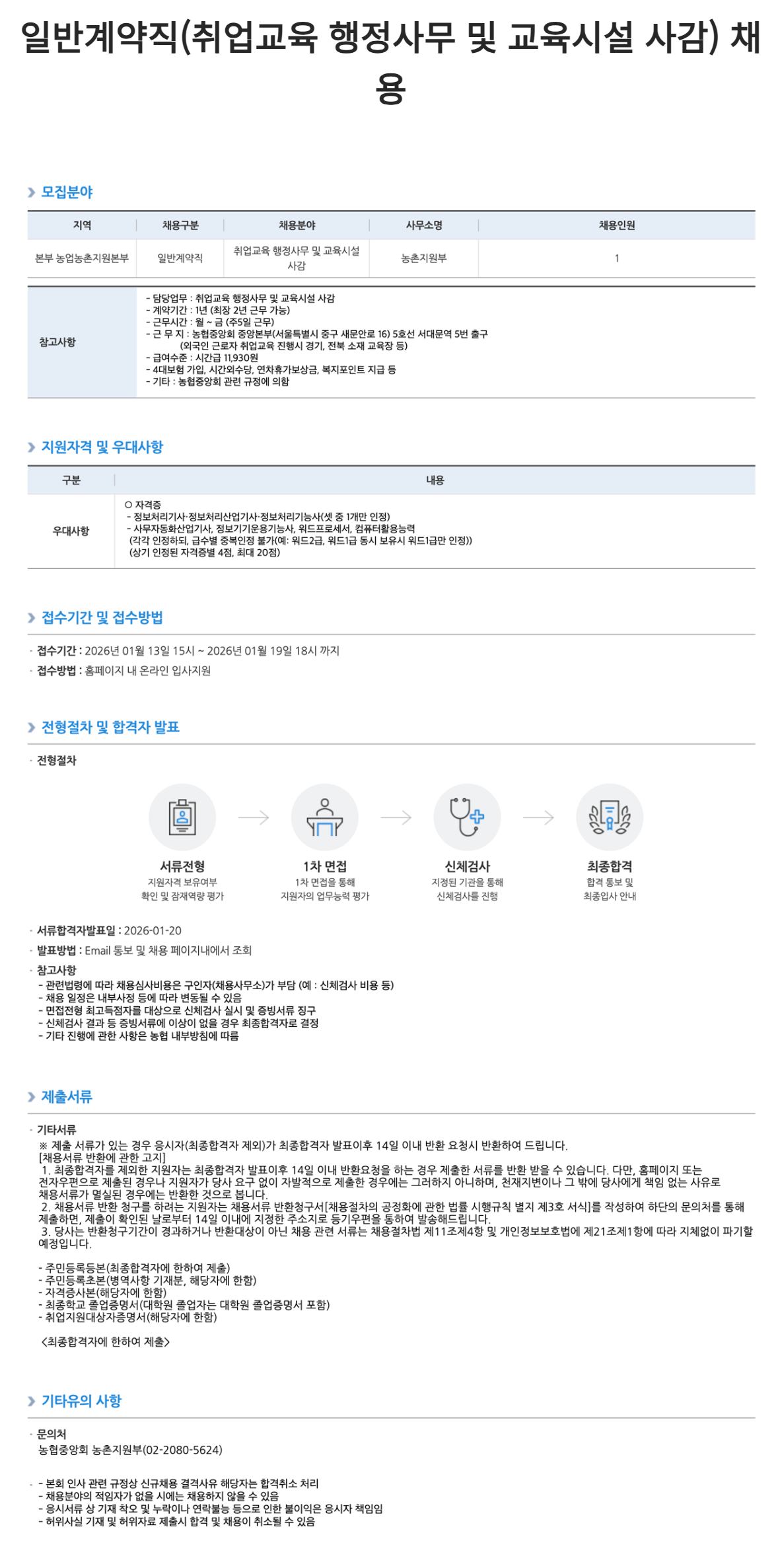 - 근 무 지 : 농협중앙회 중앙본부(서울특별시 중구 새문안로 16) 5호선 서대문역 5번 출구