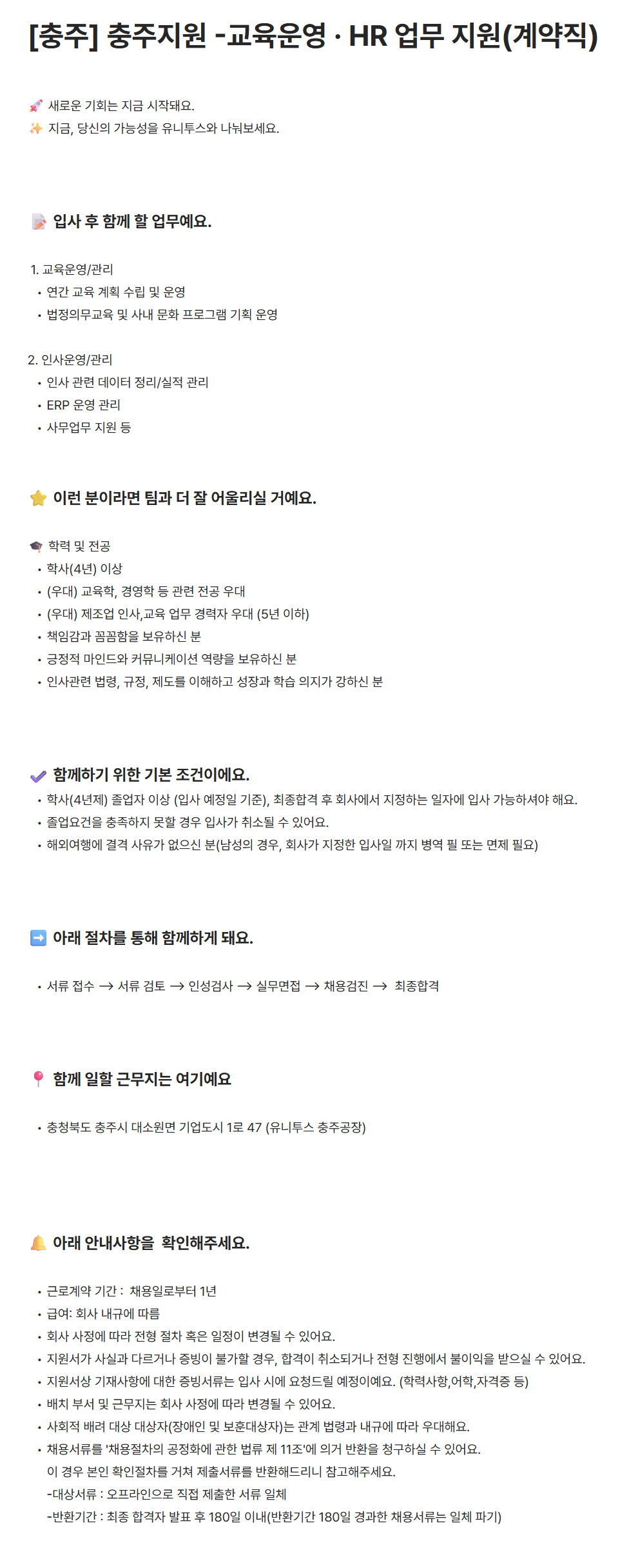 [유니투스] [충주] 충주지원 -교육운영 · HR 업무 지원(계약직)