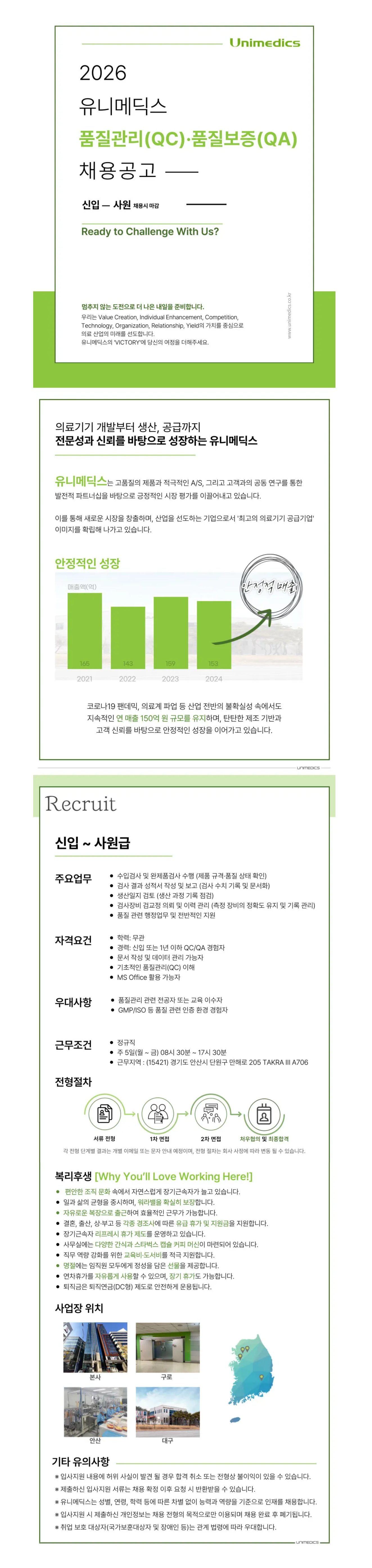 수입검사 및 완제품 검사 수행 검사 결과 성적서 작성 및 보고 생산일지 검토 검사장비 검교정 의뢰 및 이력 관리 품질 관련 행정업무 및 전반적인 지원