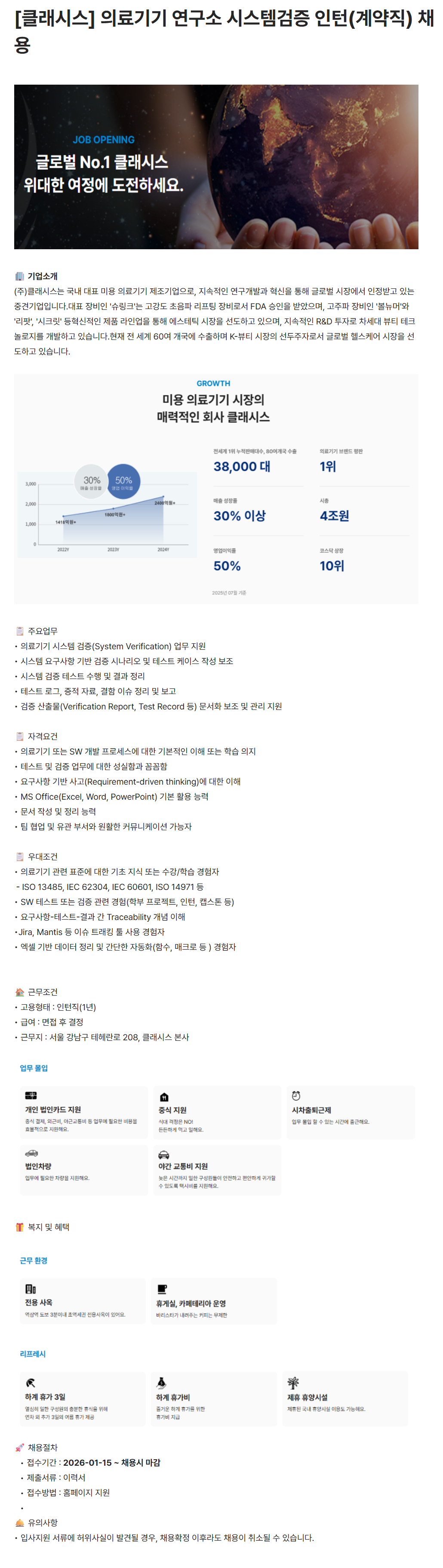 [클래시스] 의료기기 연구소 시스템검증 인턴(계약직) 채용