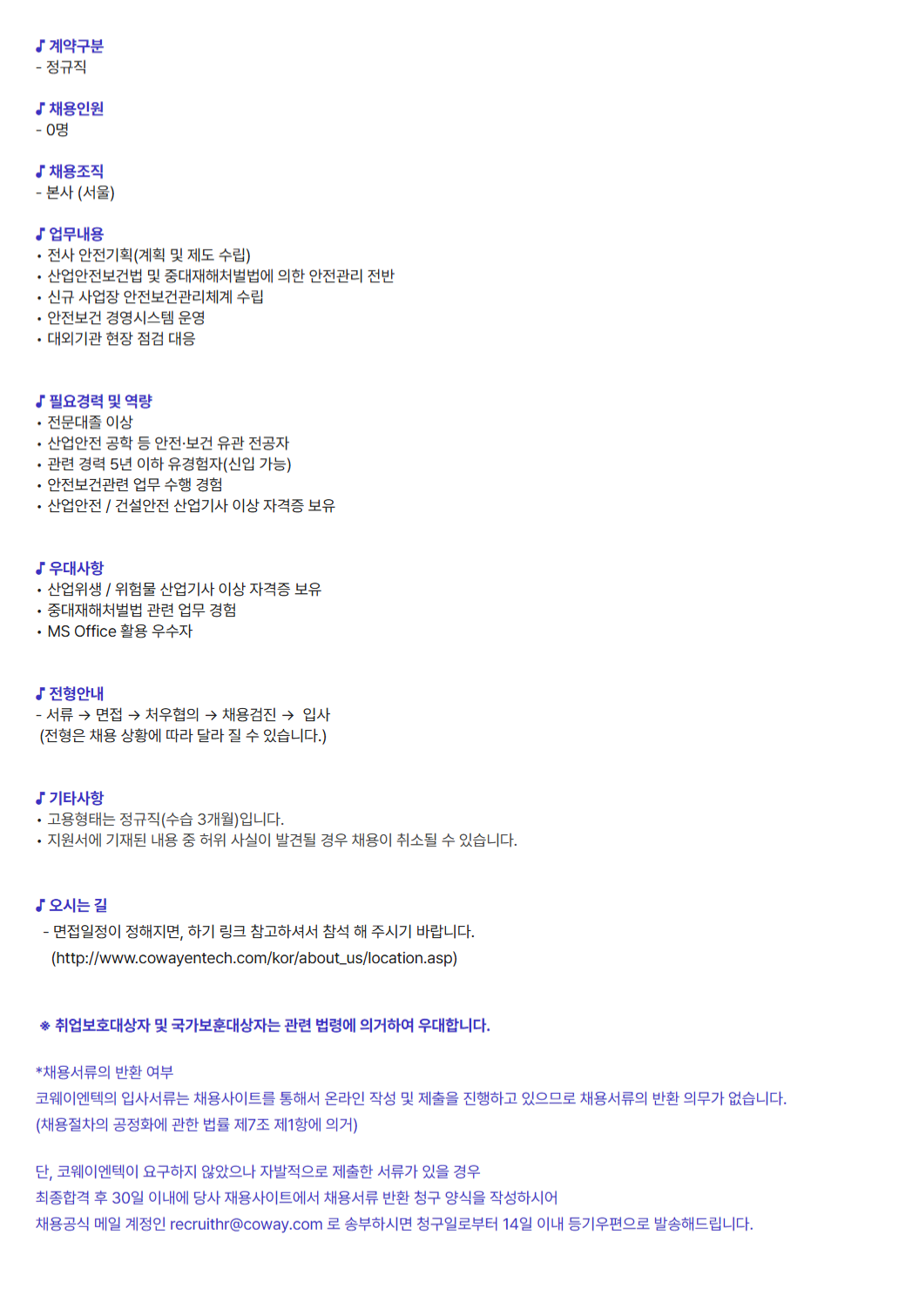 - 산업위생 / 위험물 산업기사 이상 자격증 보유 - 중대재해처벌법 관련 업무 경험 - MS Office 활용 우수자