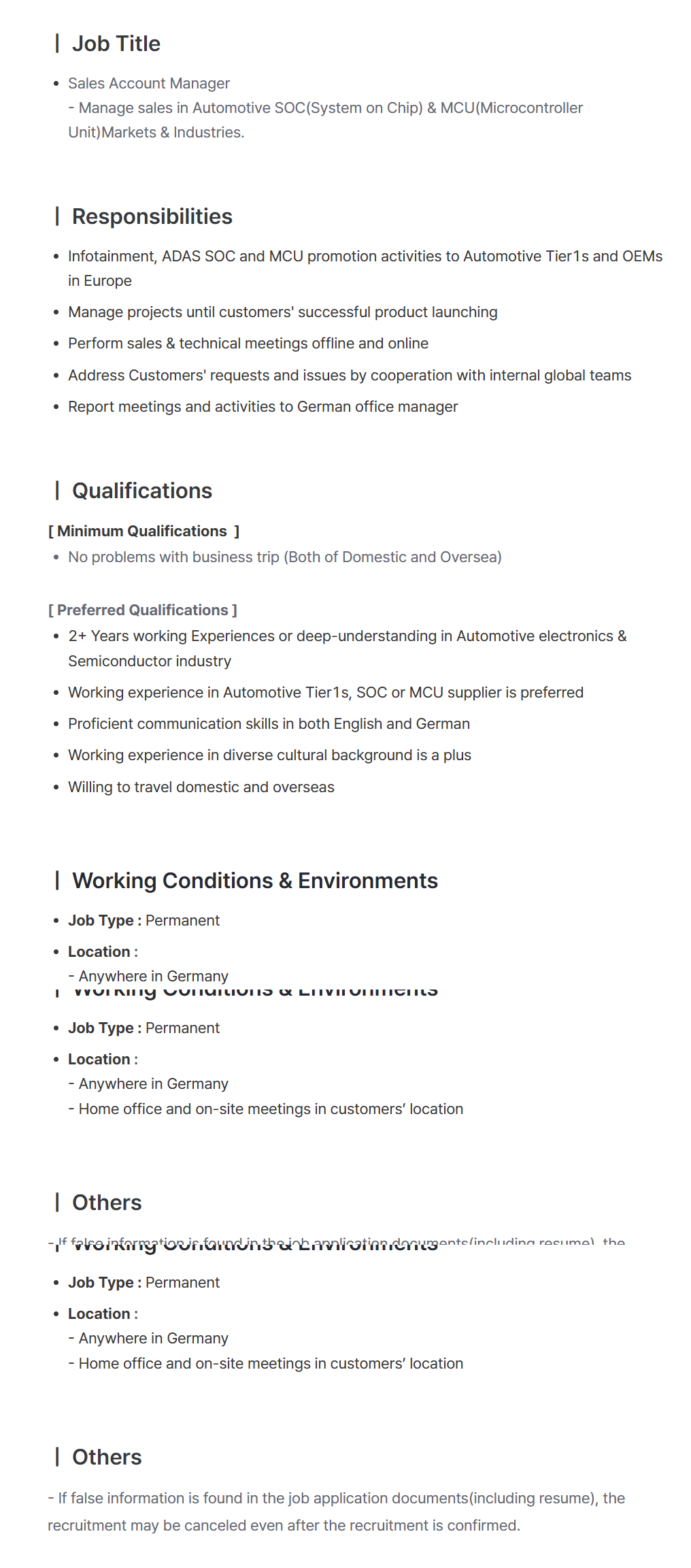 - 자동차 전자 부품 및 반도체 산업 분야 2년 이상 경력 또는 높은 이해도 보유자