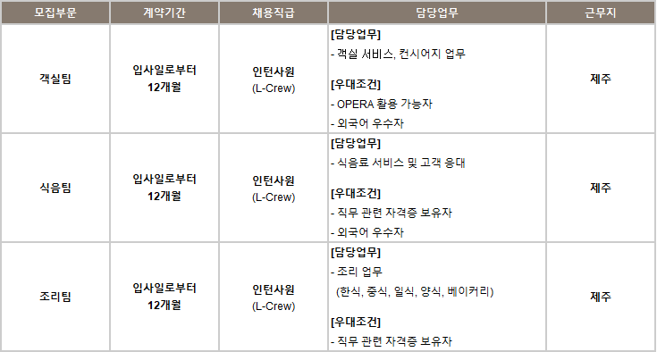 롯데호텔 제주 객실팀, 식음팀, 조리팀 L-Crew(체험형인턴) 사원을 채용합니다.