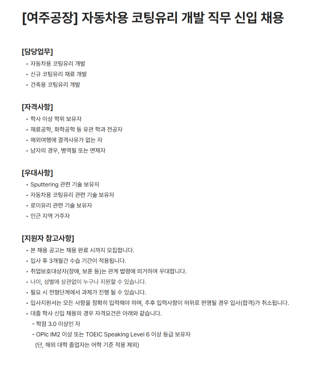 학사 이상 학위 보유자 재료공학, 화학공학 등 유관 학과 전공자 해외여행에 결격사유가 없는 자 남자의 경우, 병역필 또는 면제자
