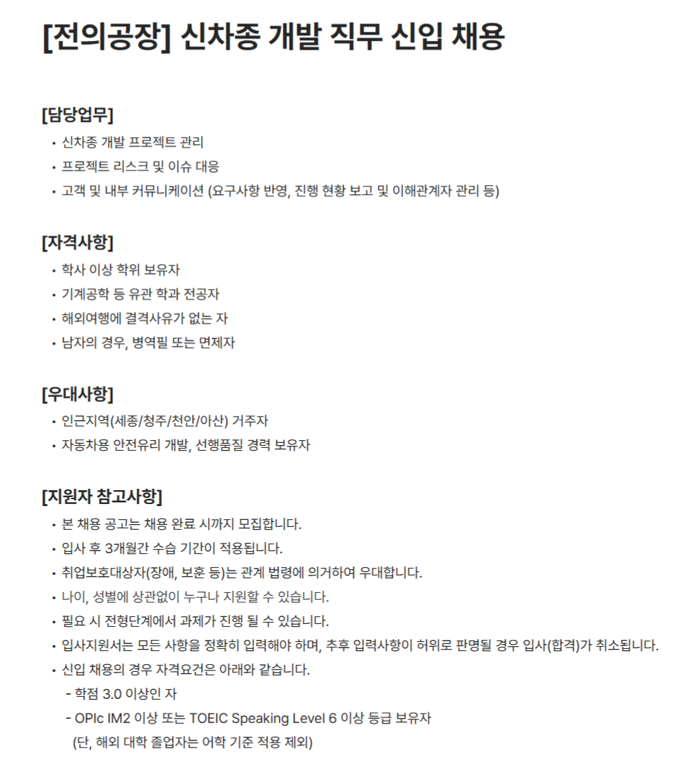 전의공장 자동차용 안전유리 신차종 개발 프로젝트 관리 전문가 채용